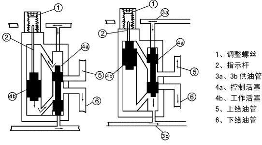 如上圖所示,由泵輸送來(lái)的潤滑脂,經(jīng)供油管3a進(jìn)入分配器控制活塞的上端,控制活塞首先向下移動(dòng)(這時(shí)控制活塞下端擠壓的潤滑脂則進(jìn)入卸荷的供油管3b),使工作活塞的上腔與控制活塞的上腔連通,然后工作活塞向下移動(dòng),這時(shí)受工作活塞的擠壓的潤滑脂經(jīng)過(guò)控制活塞的環(huán)形槽被壓送到出油口6至潤滑點(diǎn),完成第一周期的給油動(dòng)作。切換至供油管3b供油開(kāi)始第二周期的給油動(dòng)作,分配器活塞按相同的順序反向進(jìn)行前述動(dòng)作,出油口5排送潤滑脂。