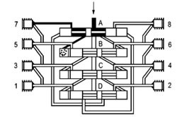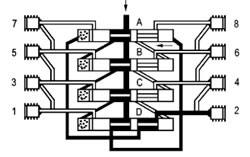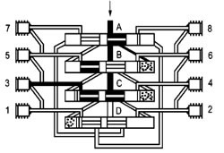 潤滑劑以箭頭方向進(jìn)入分配器壓送到活塞A的右側末端;钊鸄通過(guò)潤滑劑壓力而向左側運動(dòng)。位于活塞A左側前端的潤滑劑通過(guò)殼體內部通道輸送到排出口2 并從此通過(guò)潤滑位置管道到達摩擦位置。