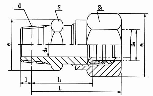 公稱(chēng)壓力E級,管子外徑D0為14mm的卡套式錐螺紋對接直通管接頭: